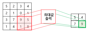 최대 풀링은 커널과 겹치는 영역 안에서 최대값을 추출하는 방식으로 다운생플링함