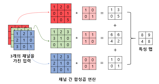 -> 높이 3, 너비 3, 채널 3의 입력이 높이 2, 너비 2, 채널 3의 커널과 합성곱 연산을 해서