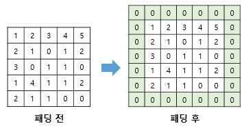 패딩은 합성곱 연산 전에 입력의 가장자리에 지정된 개수의 폭만큼 행과 열을 추가해주는 것