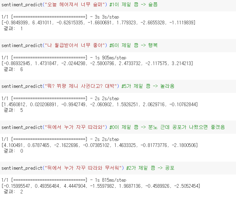위 함수는 내가 마음대로 문장을 작성하면 감정의 라벨을 만들어주는 함수다